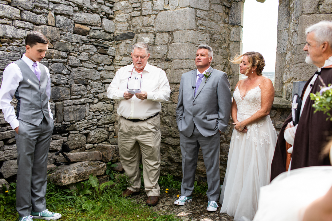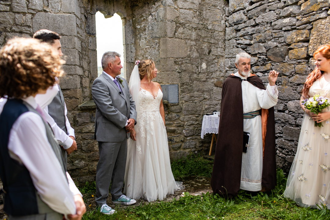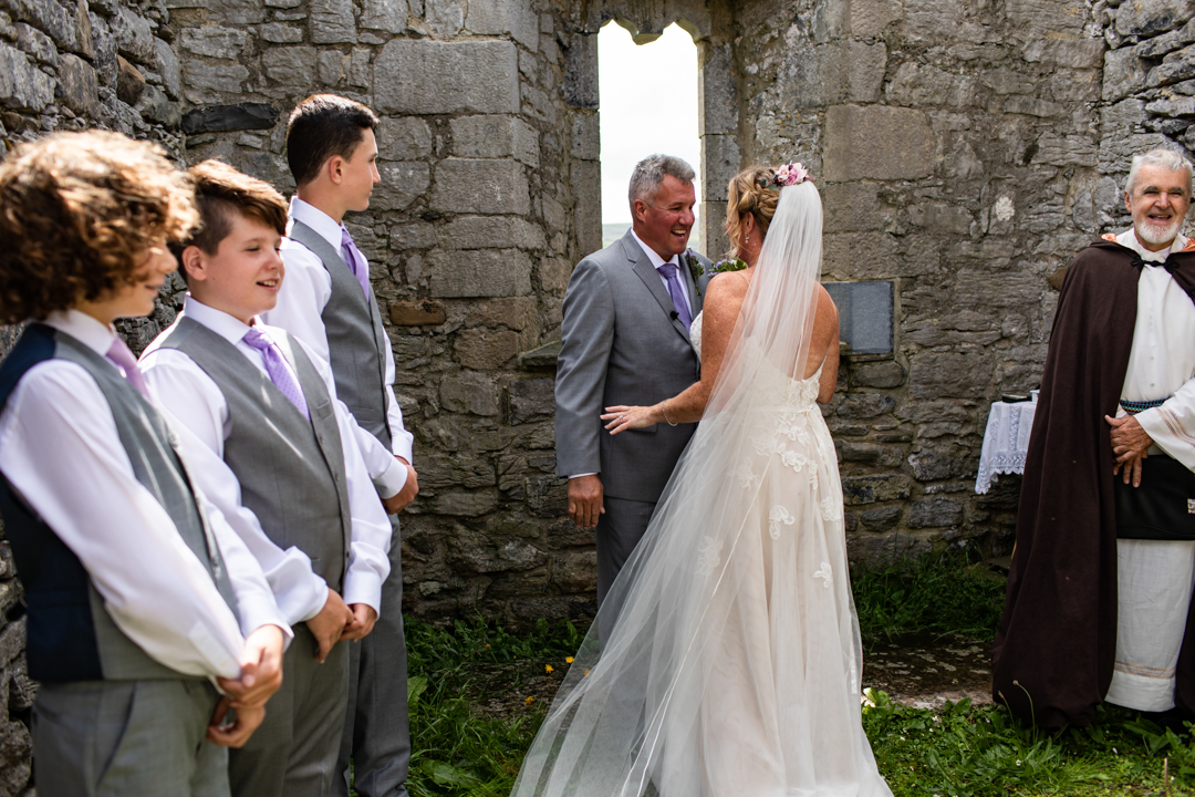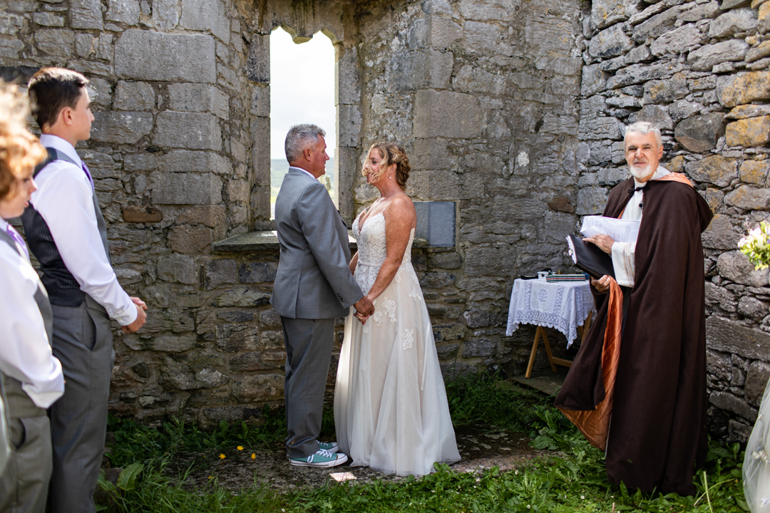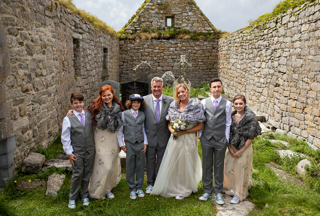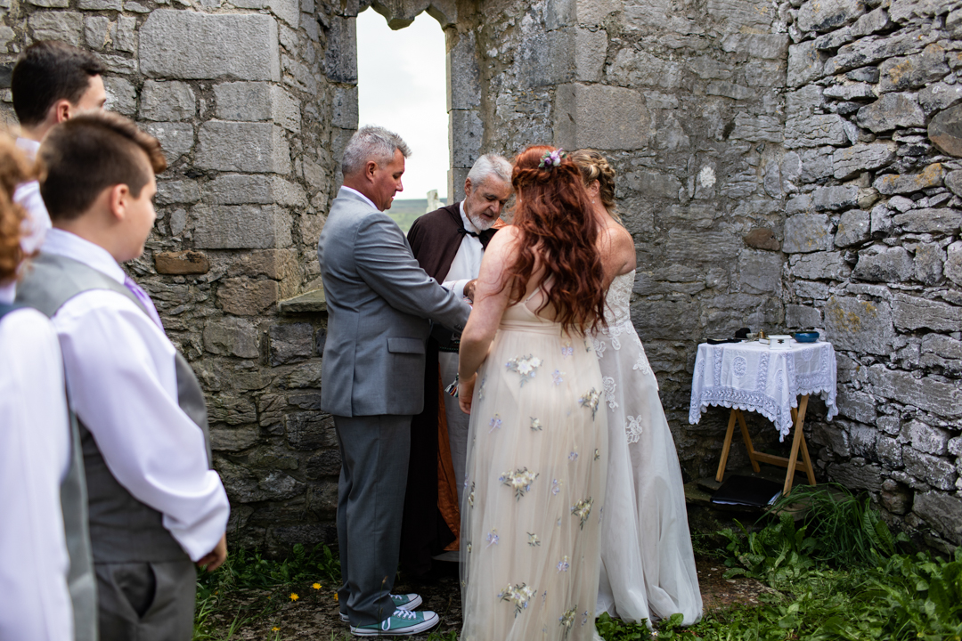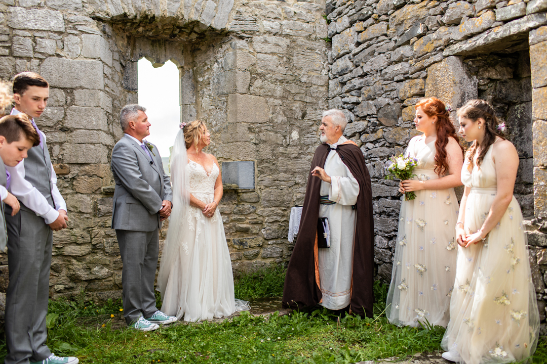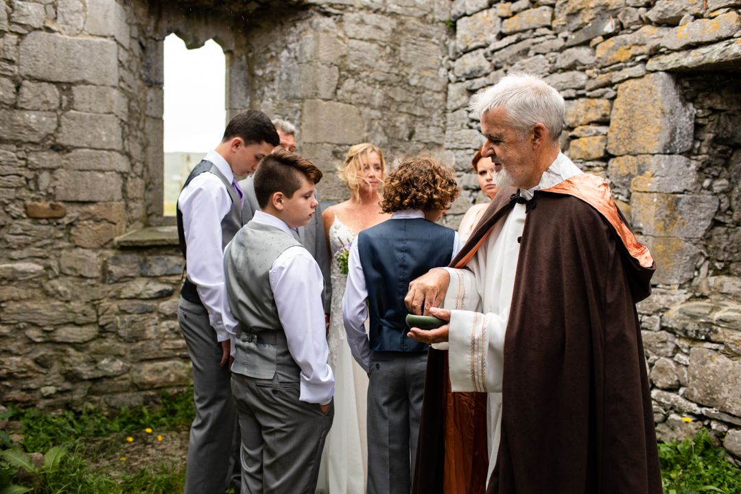 Niall Hughes, owner of The Sea View House, where we were staying, suggested we have the ceremony at the ruins of an old church. He quickly showed me pictures of the site on his phone, and I knew instantly that the vibe would be perfect for us. It was the most beautiful location. It rained a tiny bit, the sun came out, our children were happy, and our friends can not stop talking about it!