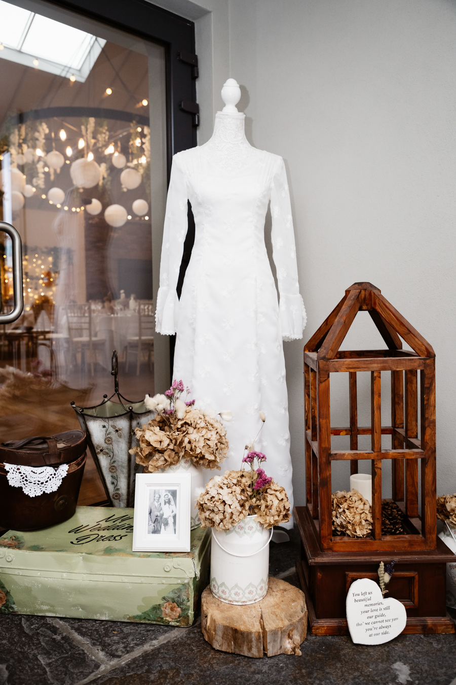 That I could involve the presence of my parents even though they have passed away. I didn’t want a remembrance corner or anything to make me sad. I wanted to celebrate them. So I had did a display of my mother’s wedding dress and my father’s top hat box. I didn’t really tell anyone what it was all about. However her side of the family were blown away as they had attended my parents wedding. I think it’s important to involve the ones who have and had a positive impact on your life. My priorities was everyone that would attend. That they would have a day to remember.