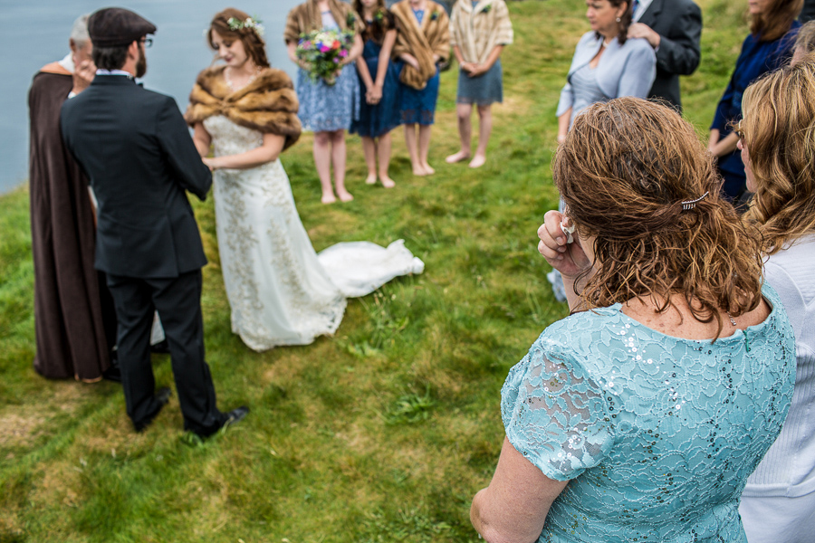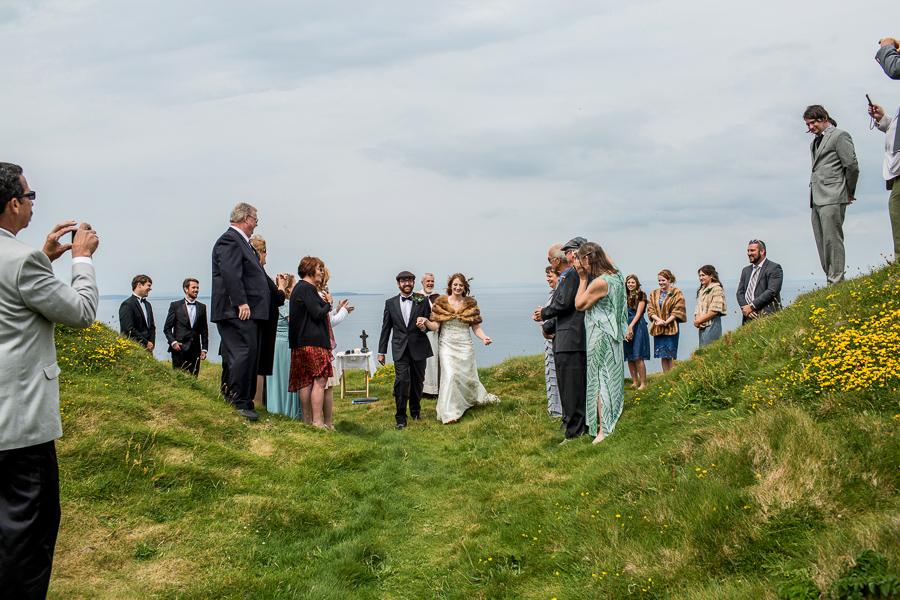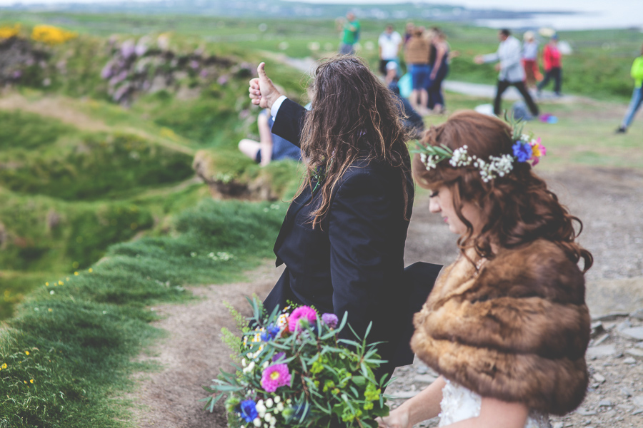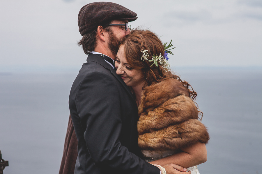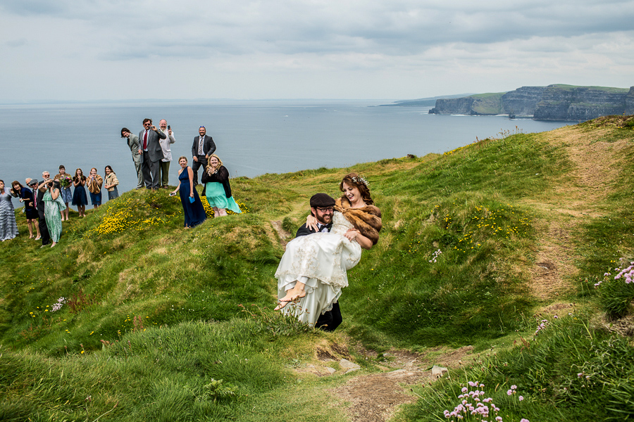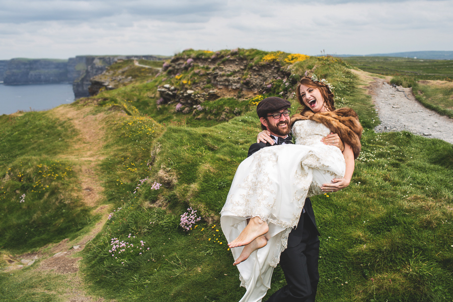 If I had to choose one special moment from the day, it would be right after the ceremony when Jake unexpectedly swooped me off the ground as we were walking “down the aisle” but actually up a hill on the Cliffs. The grass was so slippery I couldn’t even wear my shoes during the ceremony so the fact that he managed to pick me up so gracefully and get me up that hill without tumbling backwards was a miracle. Many people thought for sure he was going to drop me, but he didn’t. And Olga got the best shot of it! We also happened to have perfect weather, which is especially lucky in Ireland. I found a Child of Prague at a thrift store back home that I lugged all the way to County Claire and put out on my windowsill (along with a Rosary and Mala) the night before the wedding. All of which are separate traditions claiming to ward off rain on your wedding day. You could literally see the rain across the water on the Aran Islands, yet it never quite made it to the Cliffs. And of course the sun made an appearance as the ceremony finished. It was really special and picture-perfect.