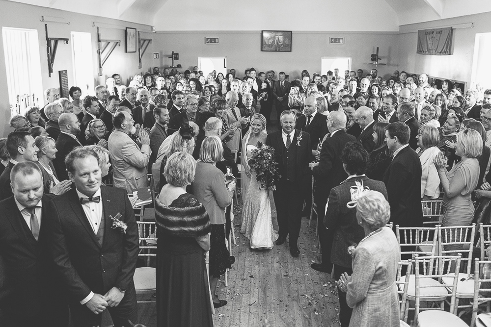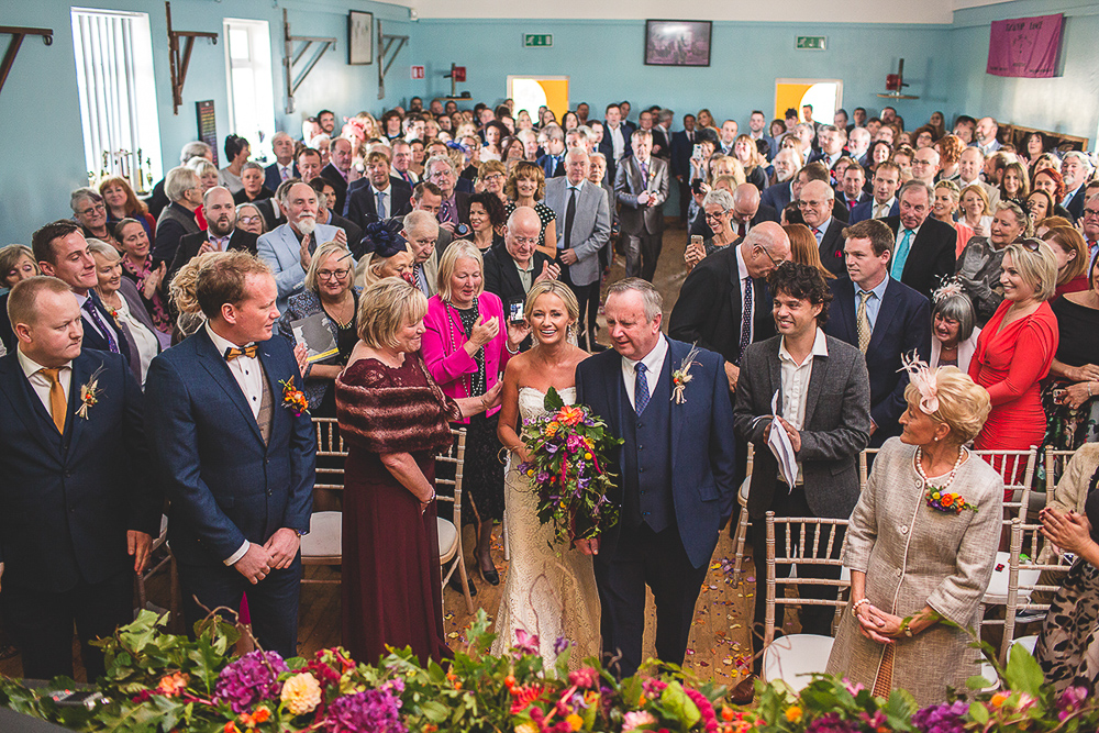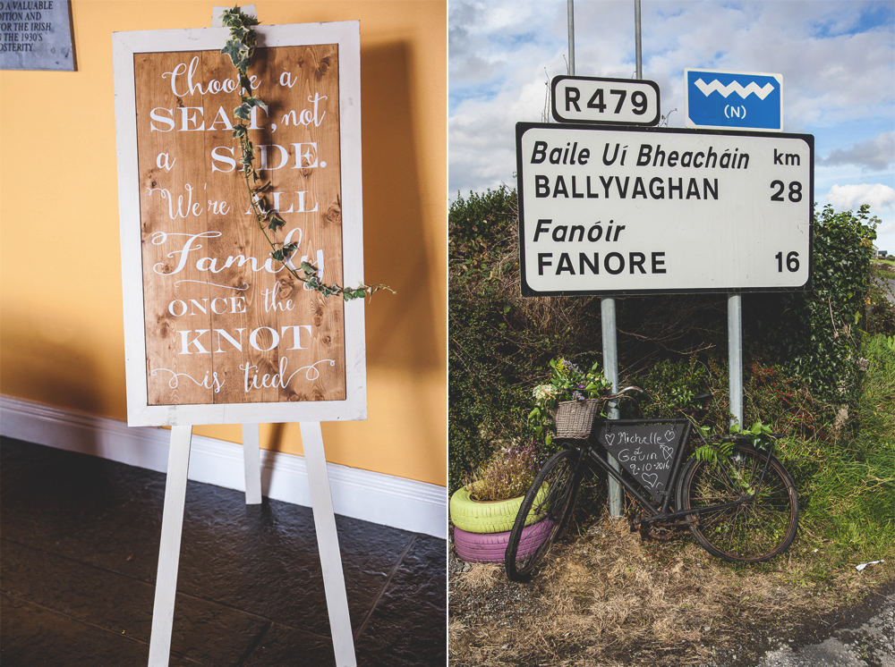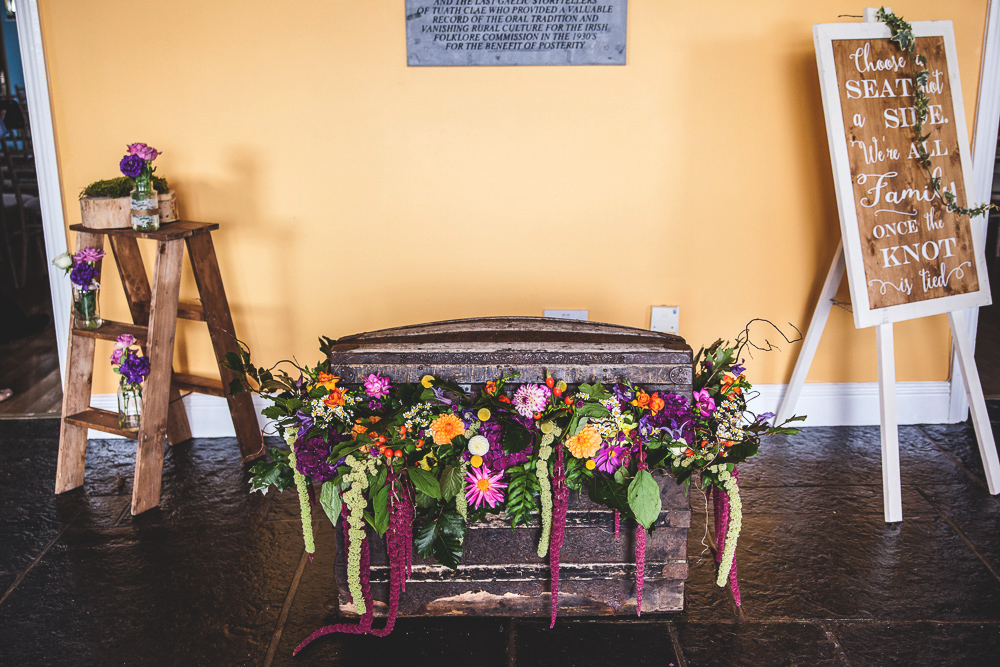 For me from day one it was the flowers. Lydia from Vintage Cut Flowers and her colleague Natasha did the most amazing job. The venue for the ceremony was a community hall with a boxing ring in it the day before the wedding. On the morning of the wedding an incredible transformation took place with help from the groomsmen, family and friends, Pauline and the lads from Hotel Doolin, Louise from Grace Events and Lydia from Vintage Cut Flowers turned it into a beautiful venue for our ceremony.