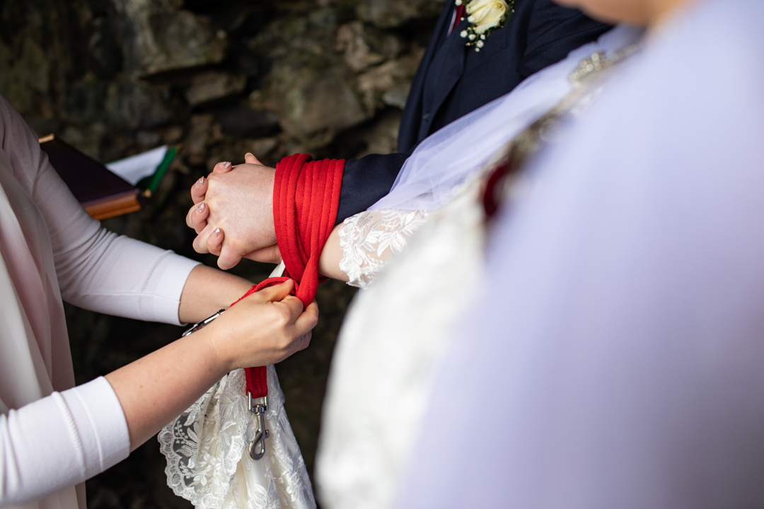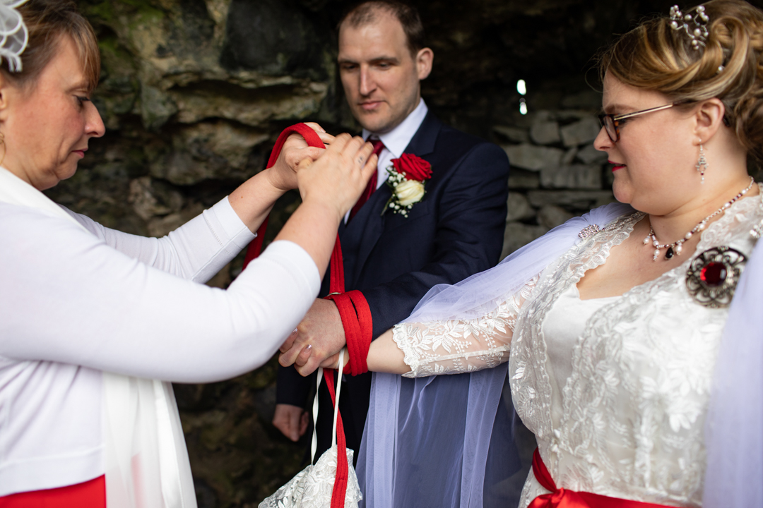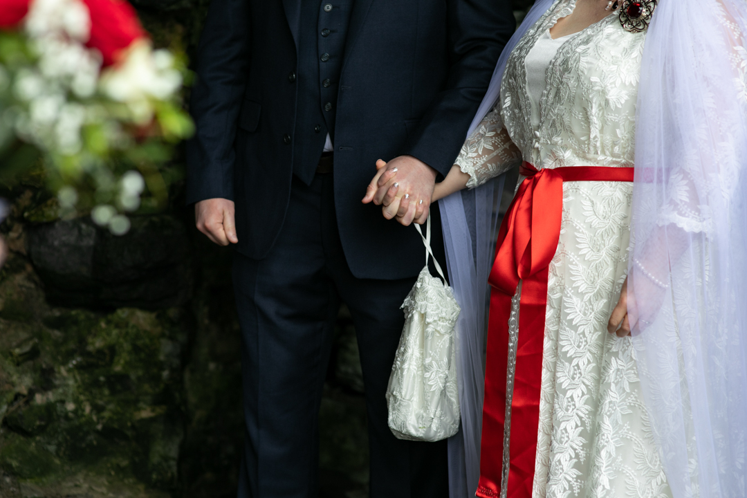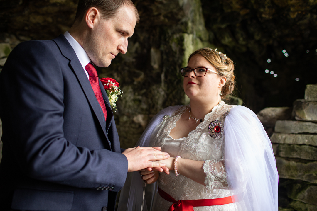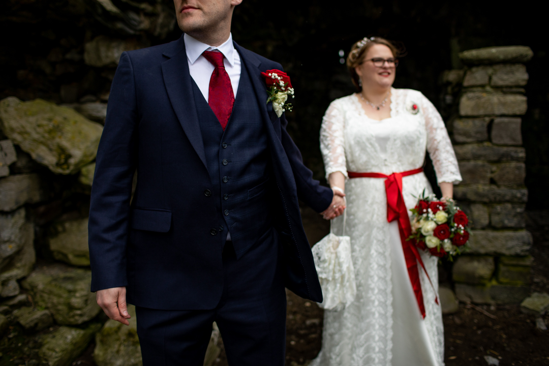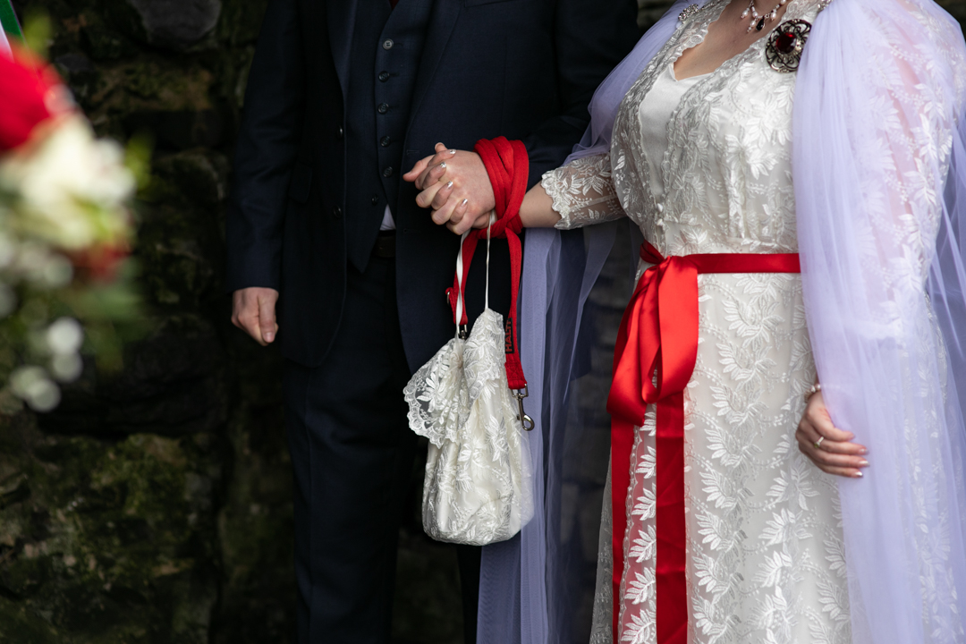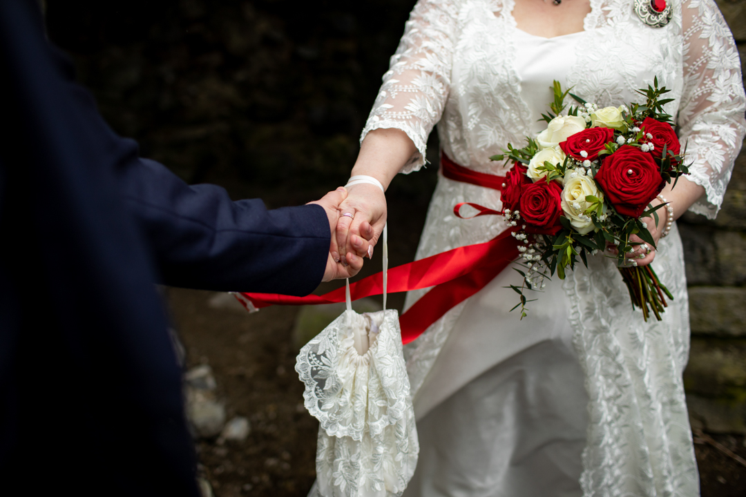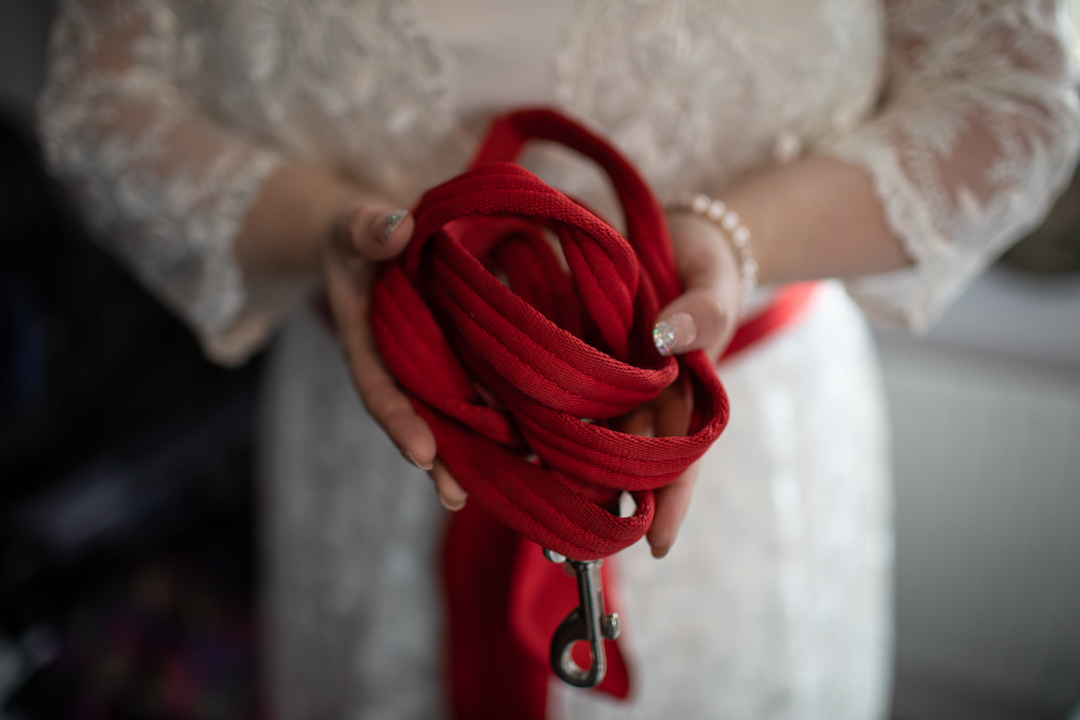 My father gave me a roman coin he’d found to incorporate into my wedding necklace as “my something old”. My mother gave me a silver sixpence with her birth year on it for my something borrowed. We have two dogs which are really important to both of us so we decided to be handfasted with their lead – which just so happened to fit in with my colours: red and ivory. The private and intimate feel of the wedding made for a simply perfect day for us.