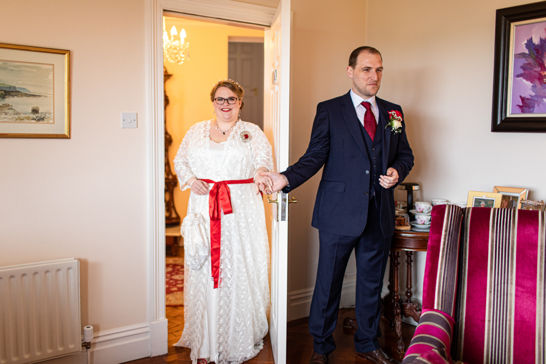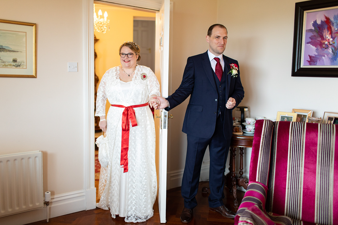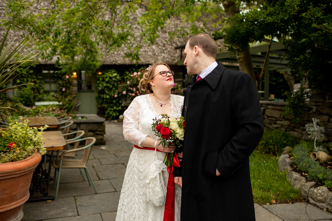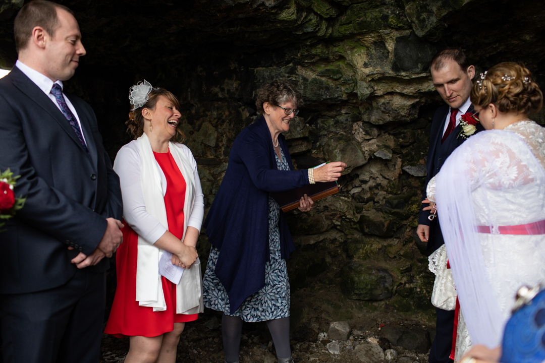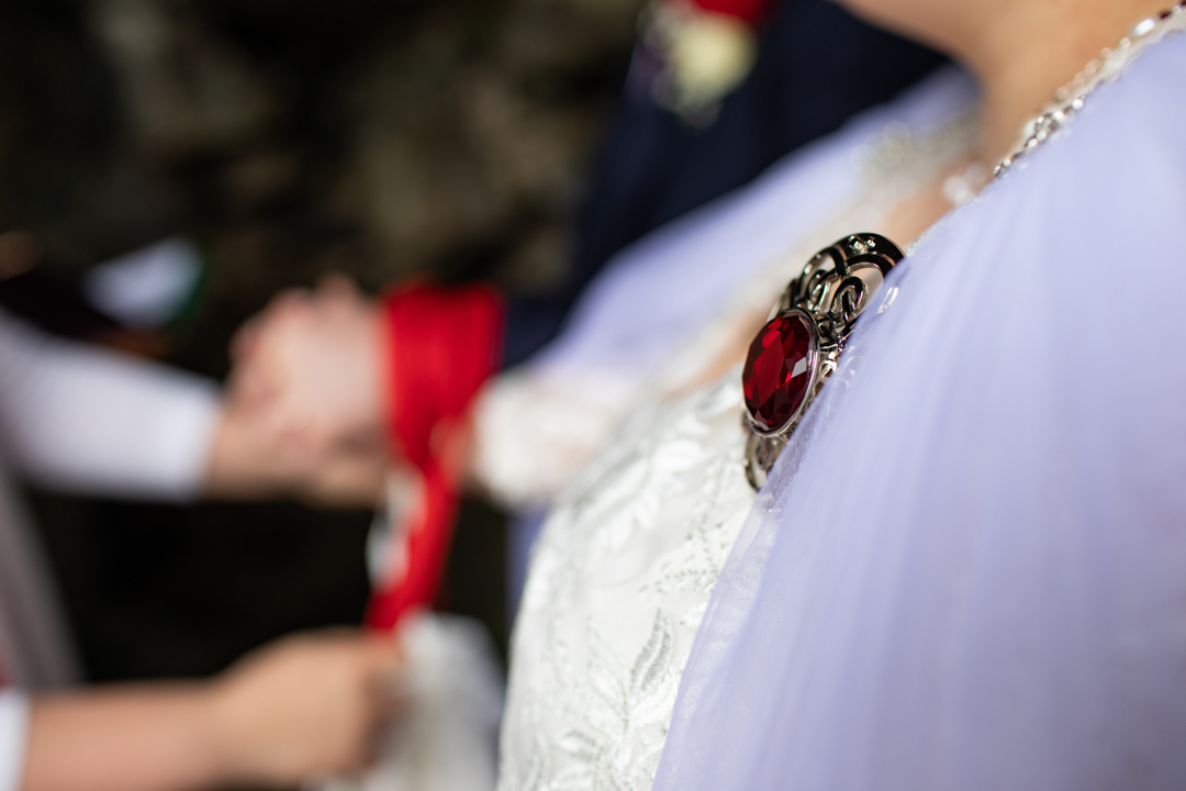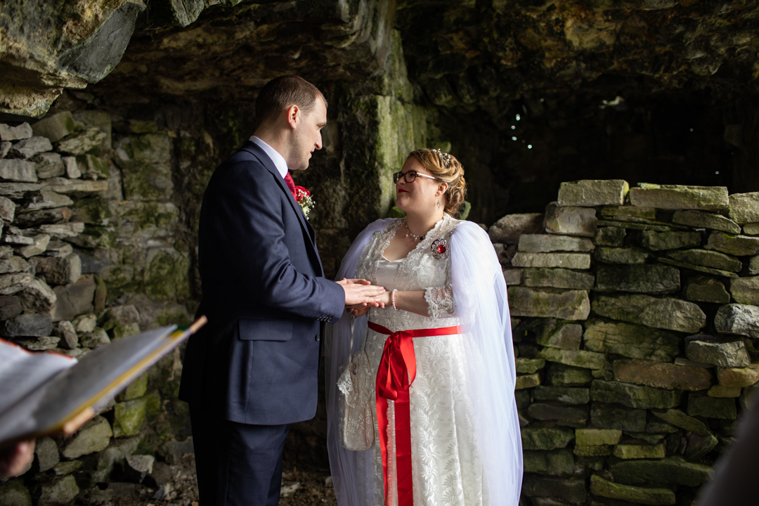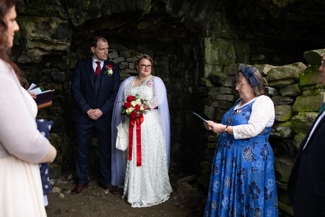 My father gave me a roman coin he’d found to incorporate into my wedding necklace as “my something old”. My mother gave me a silver sixpence with her birth year on it for my something borrowed. We have two dogs which are really important to both of us so we decided to be handfasted with their lead – which just so happened to fit in with my colours: red and ivory. The private and intimate feel of the wedding made for a simply perfect day for us.
