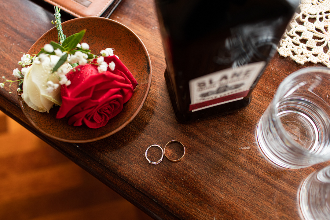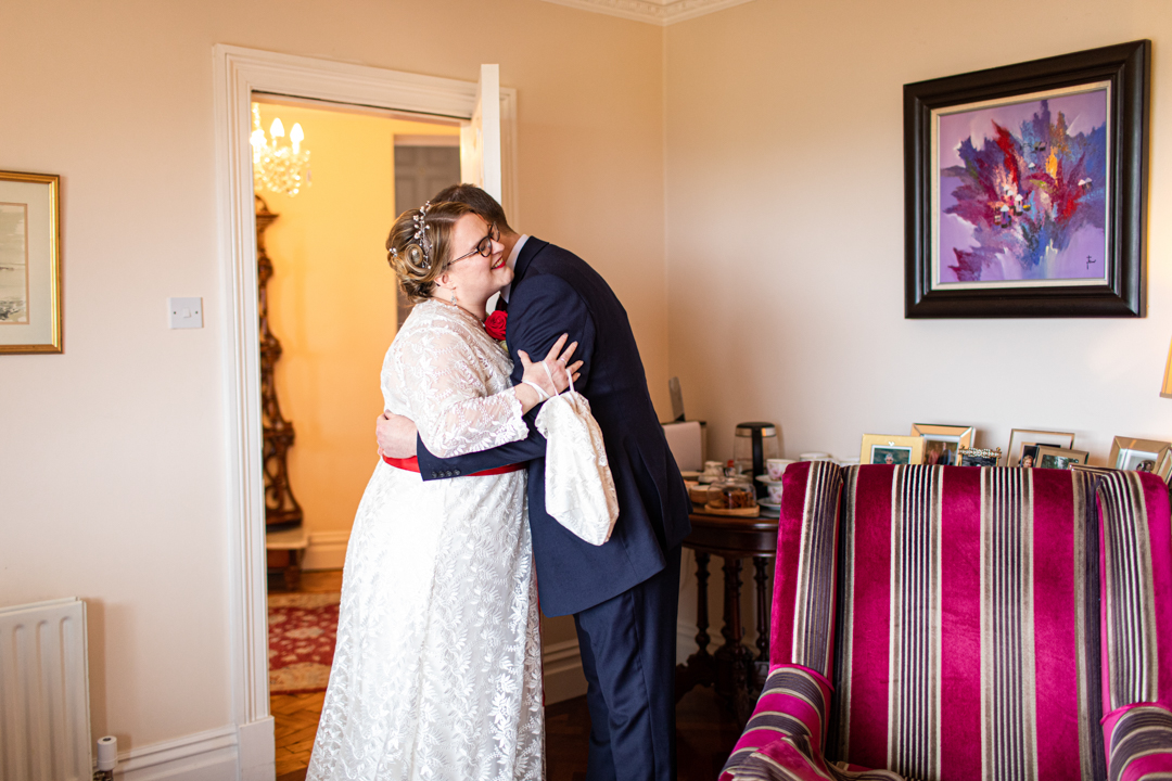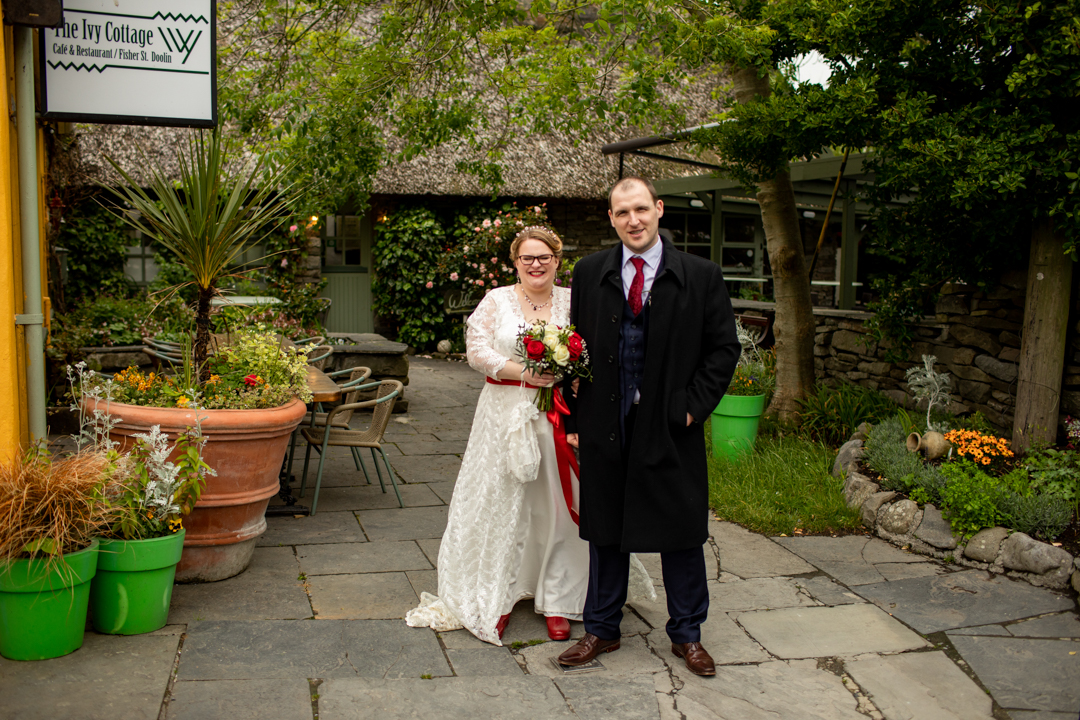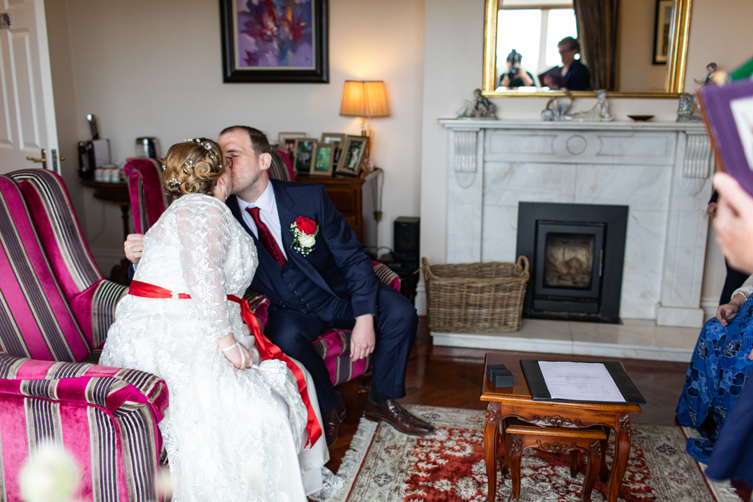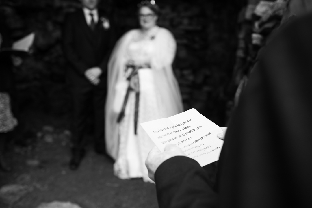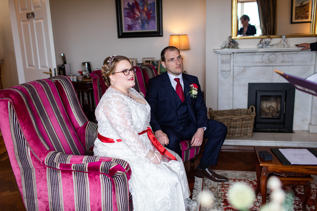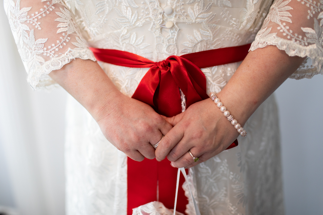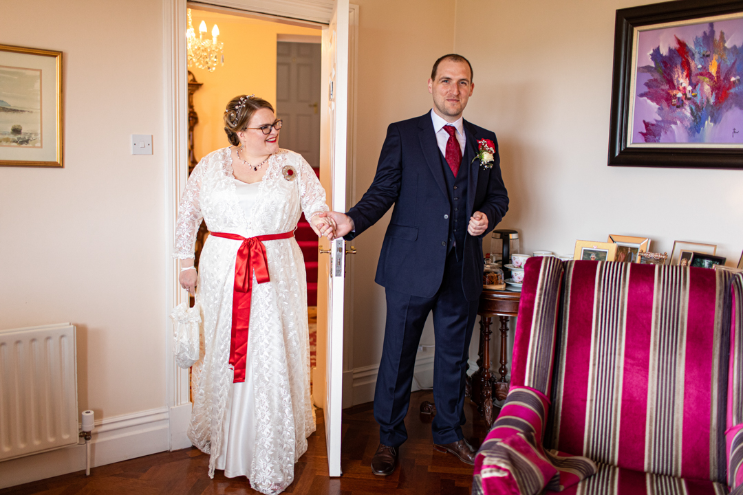 My father gave me a roman coin he’d found to incorporate into my wedding necklace as “my something old”. My mother gave me a silver sixpence with her birth year on it for my something borrowed. We have two dogs which are really important to both of us so we decided to be handfasted with their lead – which just so happened to fit in with my colours: red and ivory. The private and intimate feel of the wedding made for a simply perfect day for us.