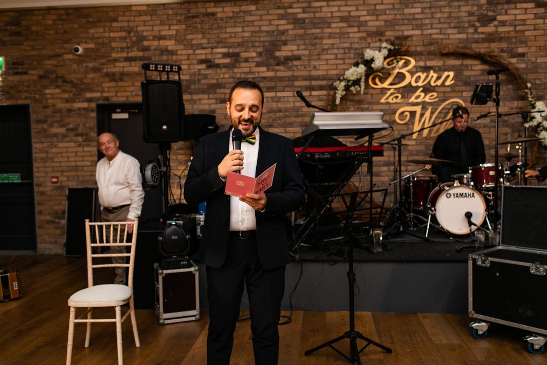 Charming and full of love Irish wedding ceremony in a rustic barn filled with family and amazing friends .