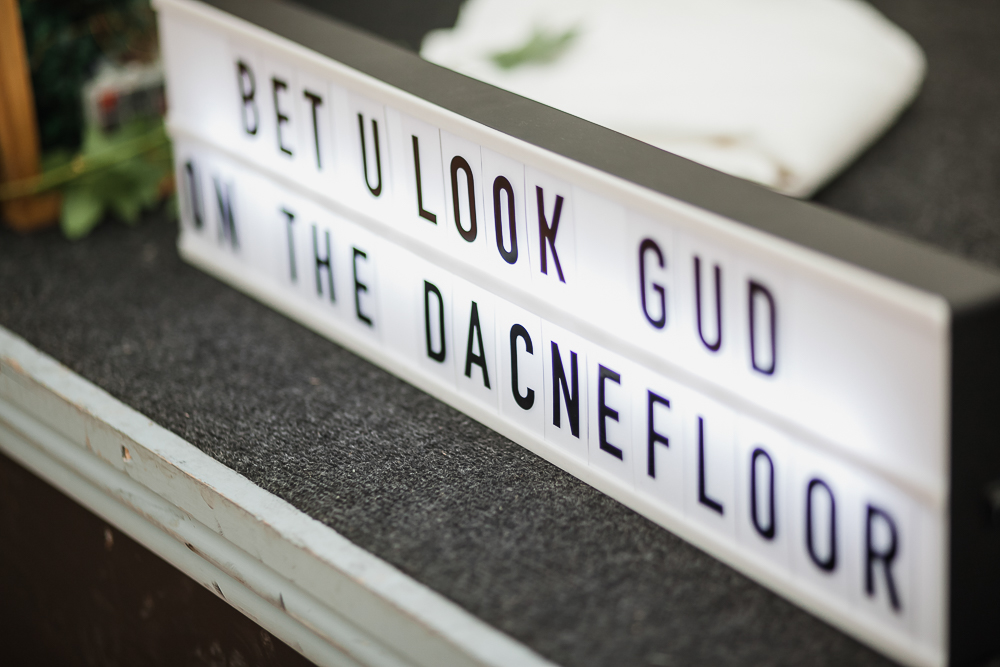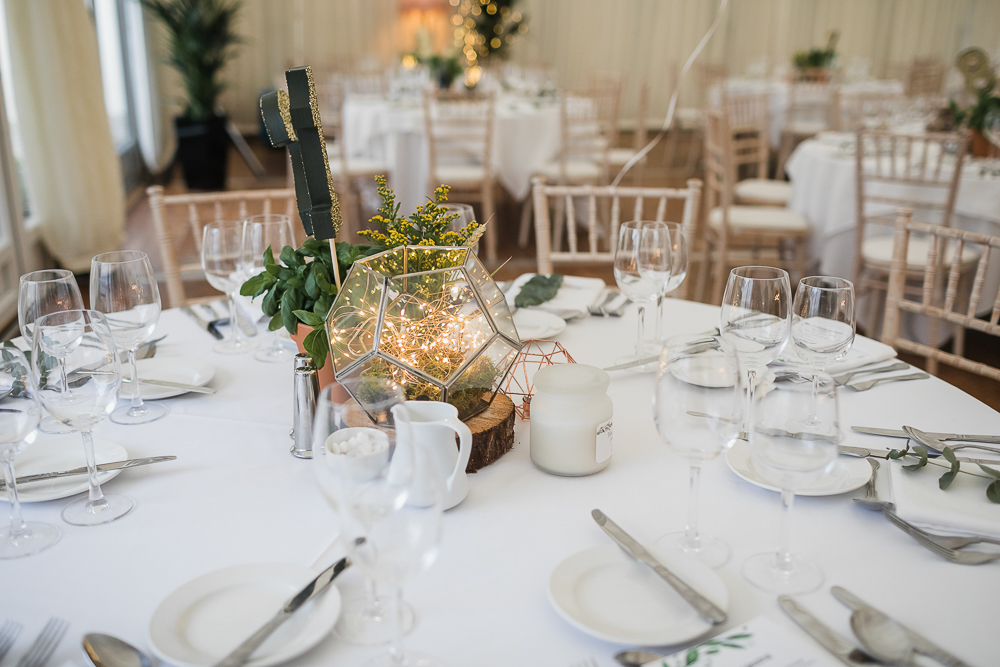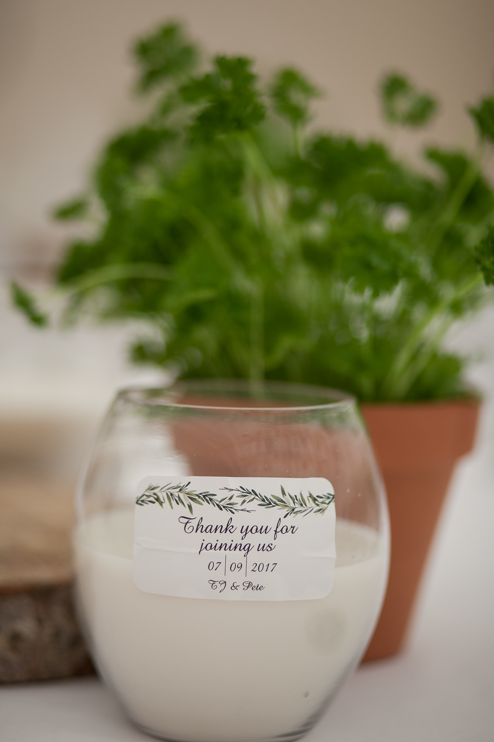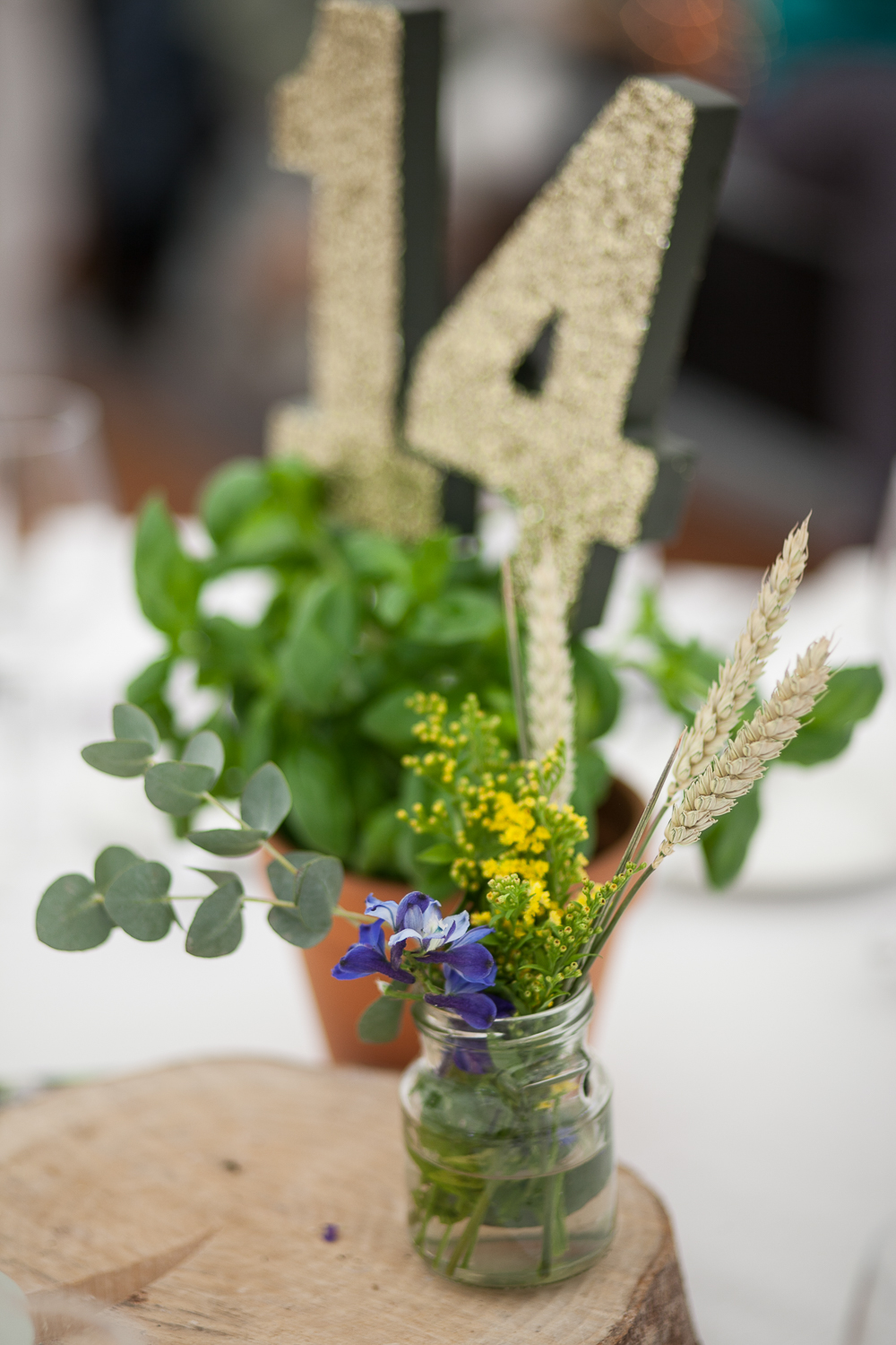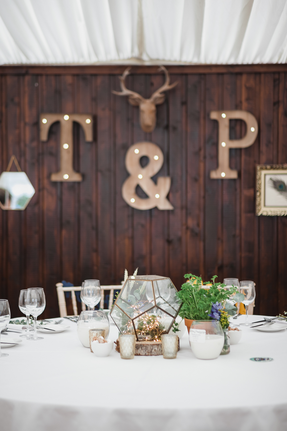 Our ‘theme’ was simply everything we liked. We decided to make the place feel like an extension of our house with our wooden backdrop, lamps & soft glows from candles & lots and lots of plants around. We really like natural earthy colours and textures so we incorporated these in anyway we could. We used herbs as our centre pieces with homemade table numbers which added a bit of a light hearted disco feel for the evening as they reflected all the different lights around the room!