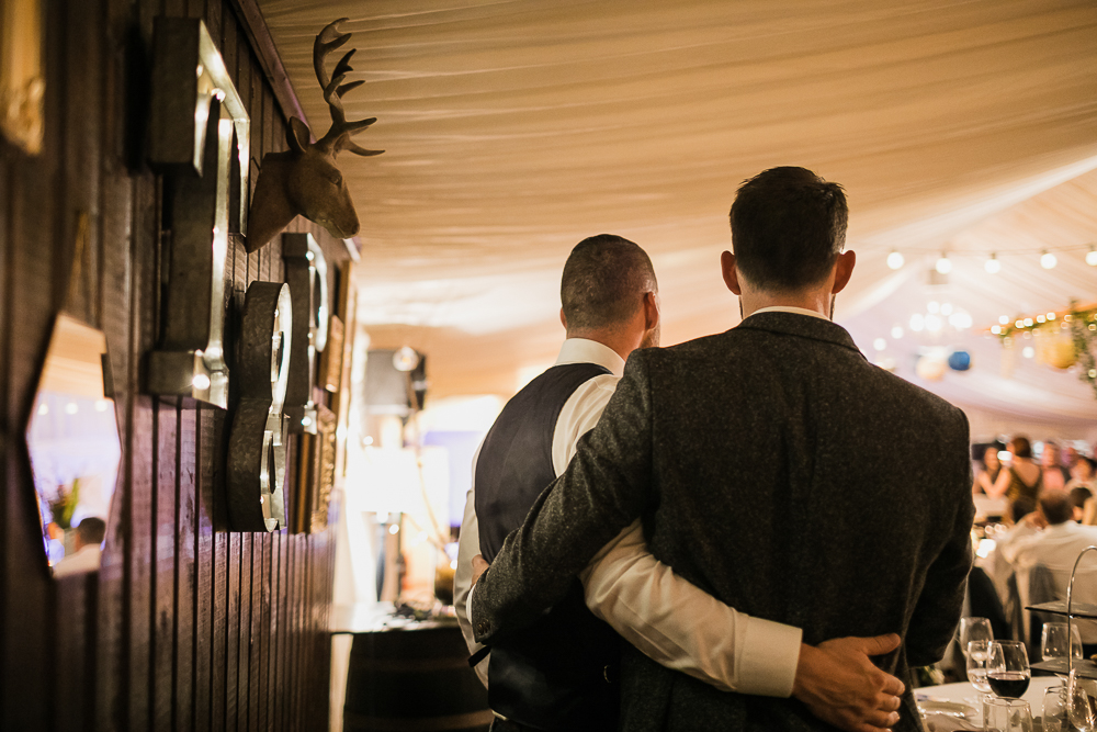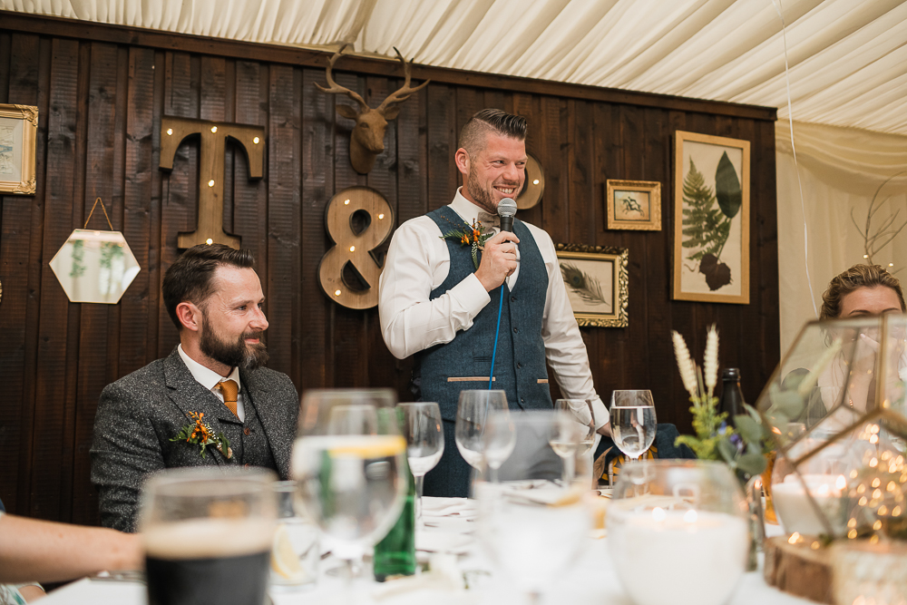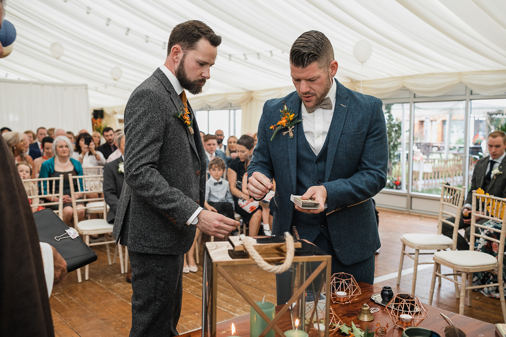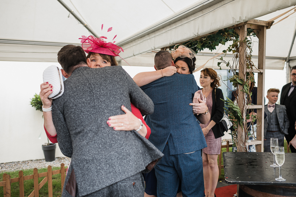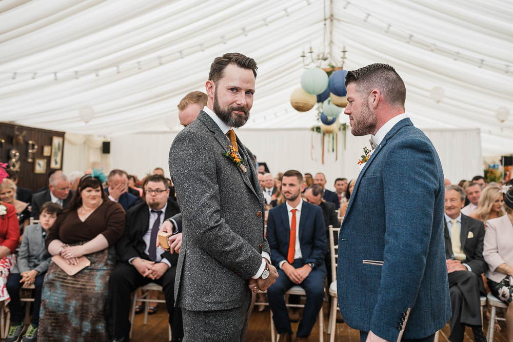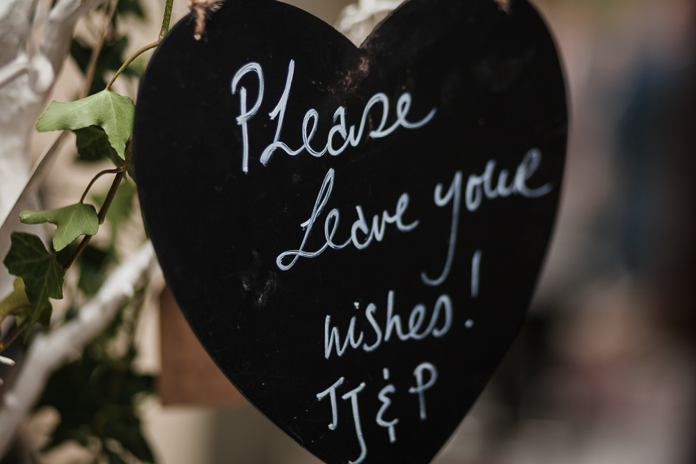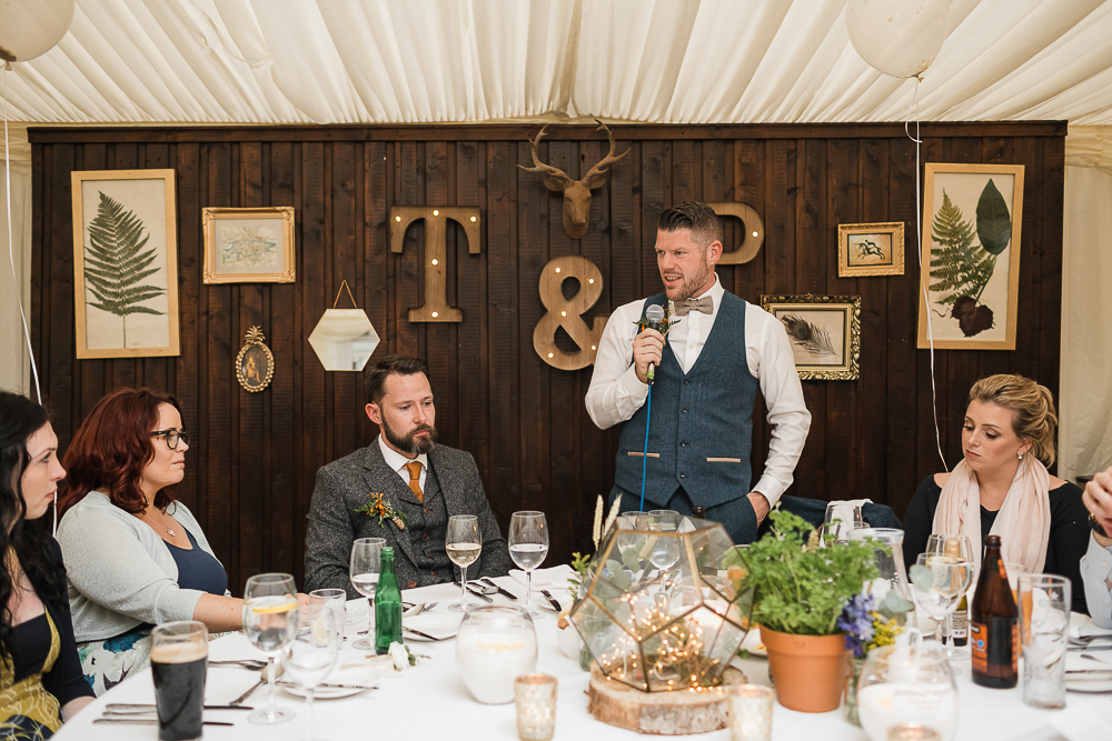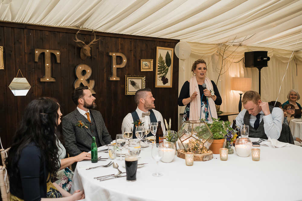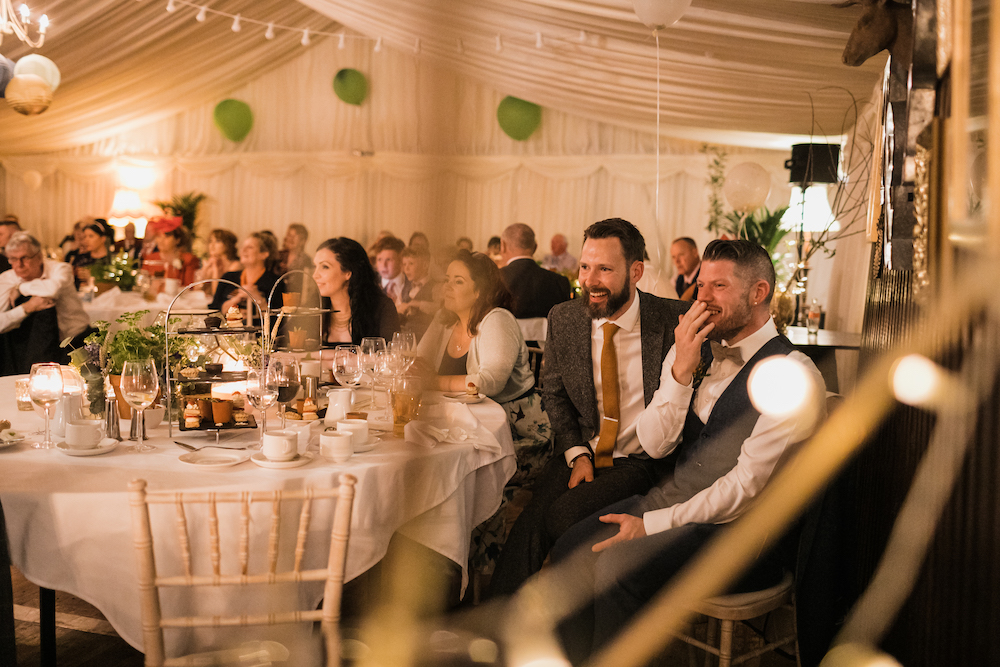 We had a humanist ceremony in the Hotel marquee. Our celebrant Dara was great to deal with and allowed us to make the ceremony our own. We had readings from TJ’s sister, Elaine, and Pete’s brother, Robert. It turned out to be a very emotional ceremony, which was not what we expected. We also incorporated a tree potting in to the ceremony. Our mothers both brought a pot of soil from their gardens. They added this together around the roots of a small apple tree, which we will plant on in years to come. It made the occasion really special and lots of people commented on how lovely it was.
